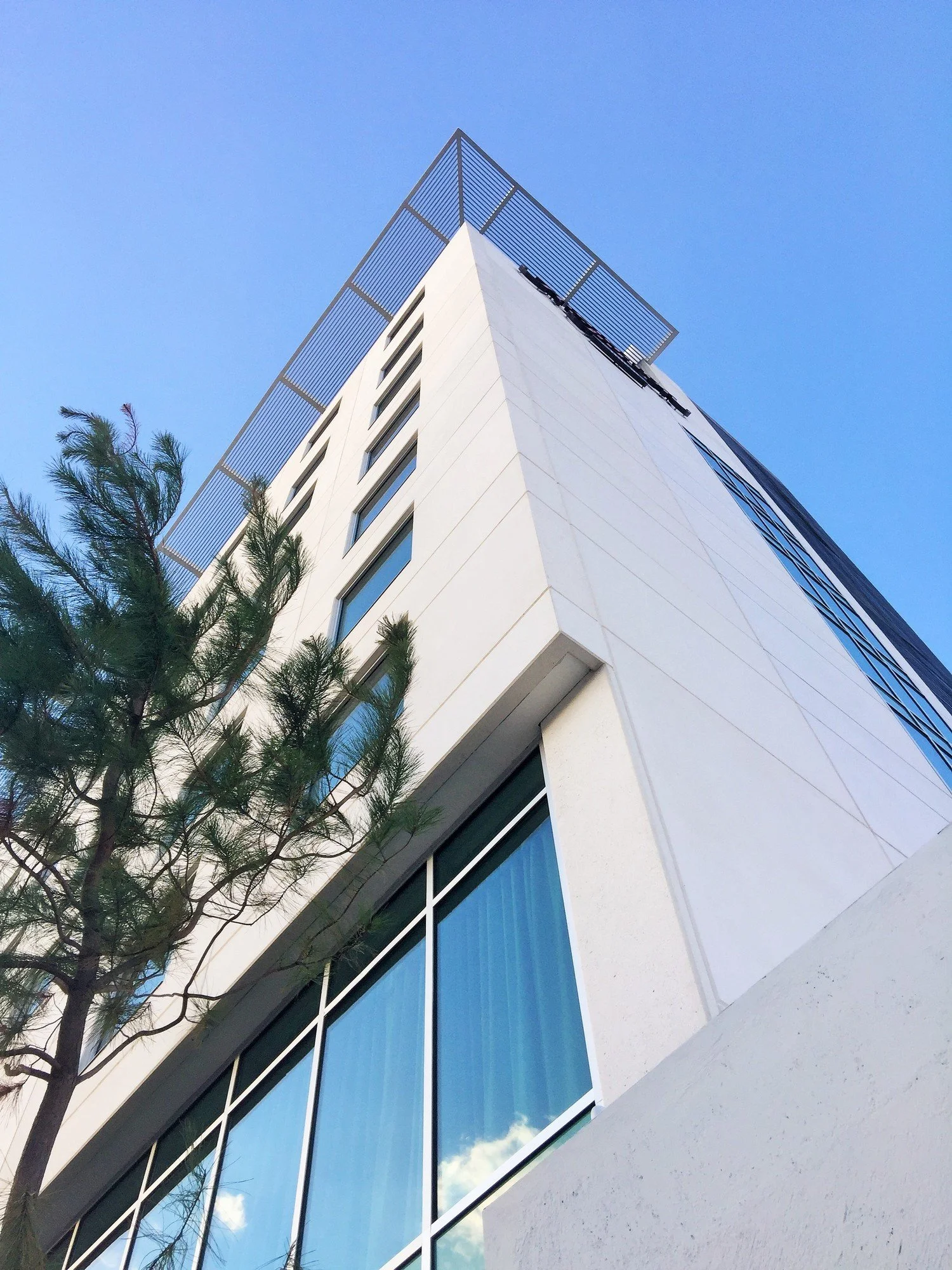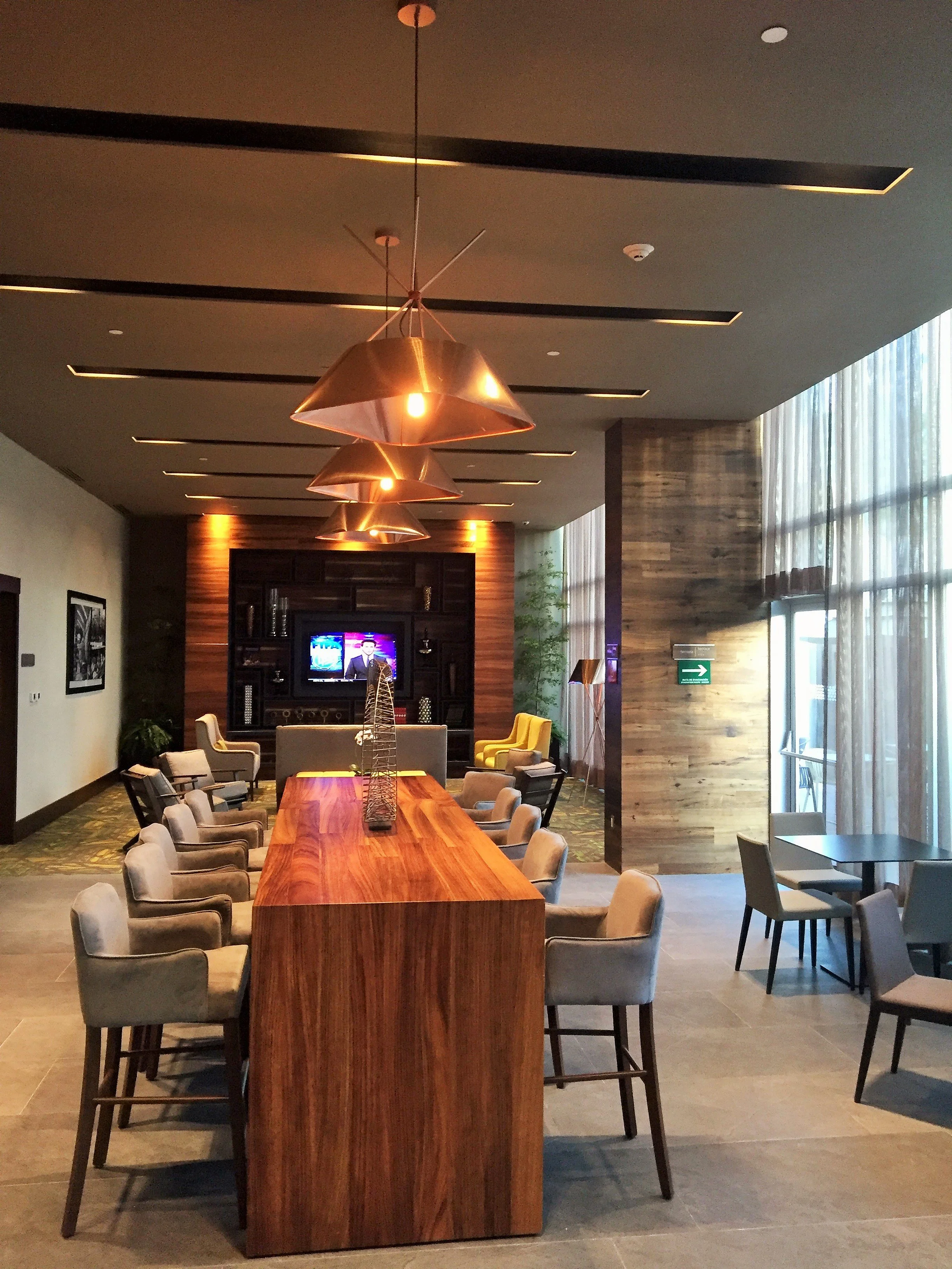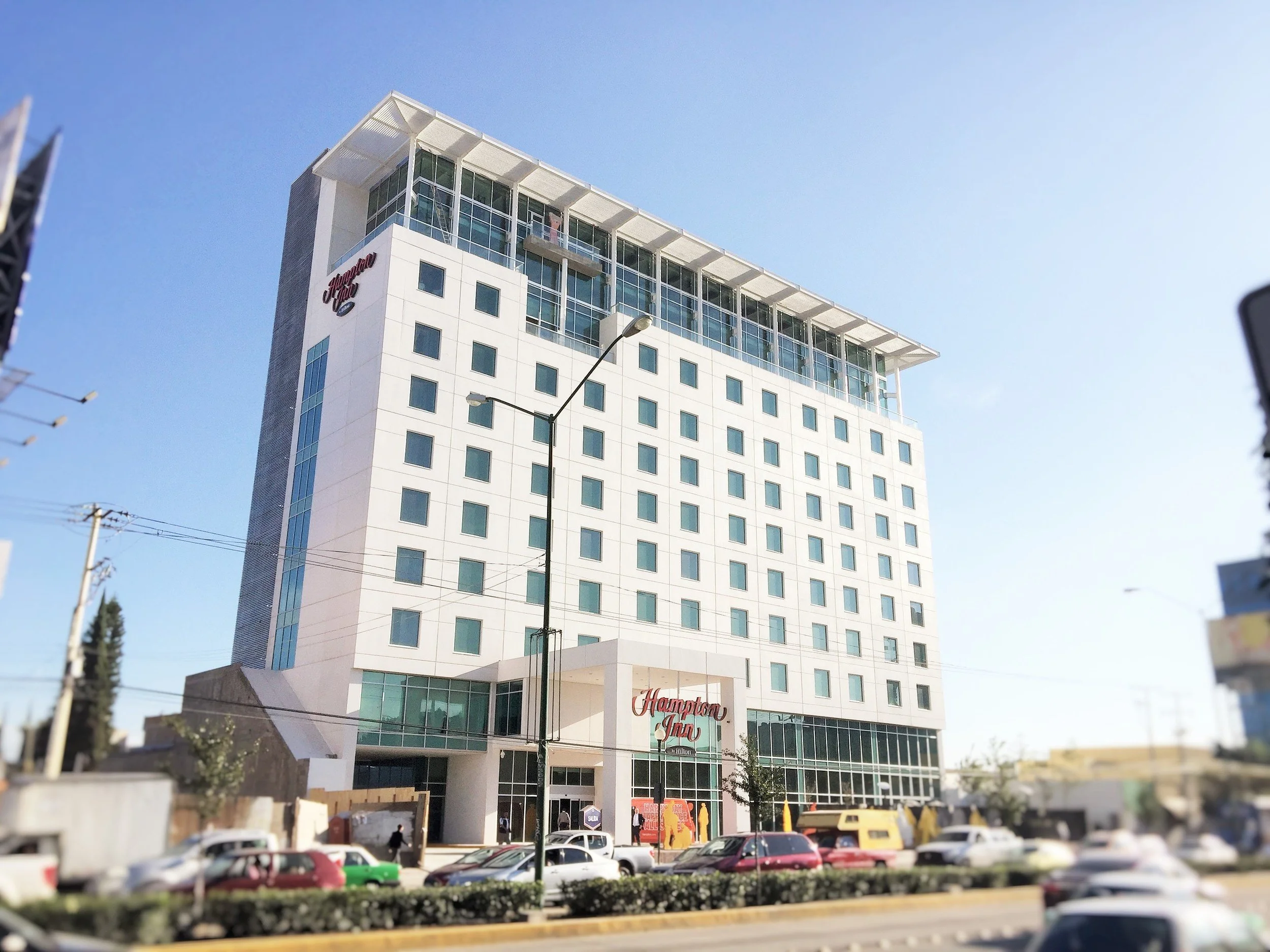 Marking the first Hilton-branded hotel in Leon, Mexico, SOW was very excited to work on this new addition to what is considered the hospitality district in Leon. Leon is characterized for manufacturing and their annual expo fairs that flood the city with visitors from all over the world. The site is located across the boulevard from the civic center where the Guanajuato Museum of anthropology, the state library and main university sit. The architecture of the Hampton Inn hotel responds to the hotel chain's brand standards but also to the regional climate of Leon. The change in use (to office spaces) at the top three floors of the building gave us an opportunity to articulate the Bris soleil overhang space that provides shade for the south facing glass walls.